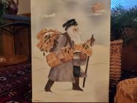 Original painting on stretched canvas by Gladys Desmond, The Itinerant Painter, 9x12 Santa Delivering Presents. Gladys lives in Rhode Island in a 1600's farmhouse that once sheltered itinerant farm workers. She has continued in the tradition of her home by calling her business "The Itinerant Painter". Having lived in New England all of her life, with it's rich abundance of history, traditional farms and landscapes, she captures and paints them in a primitive manner. Gladys paints on antique and reproduction surfaces, as well as traveling throughout New England and painting murals.