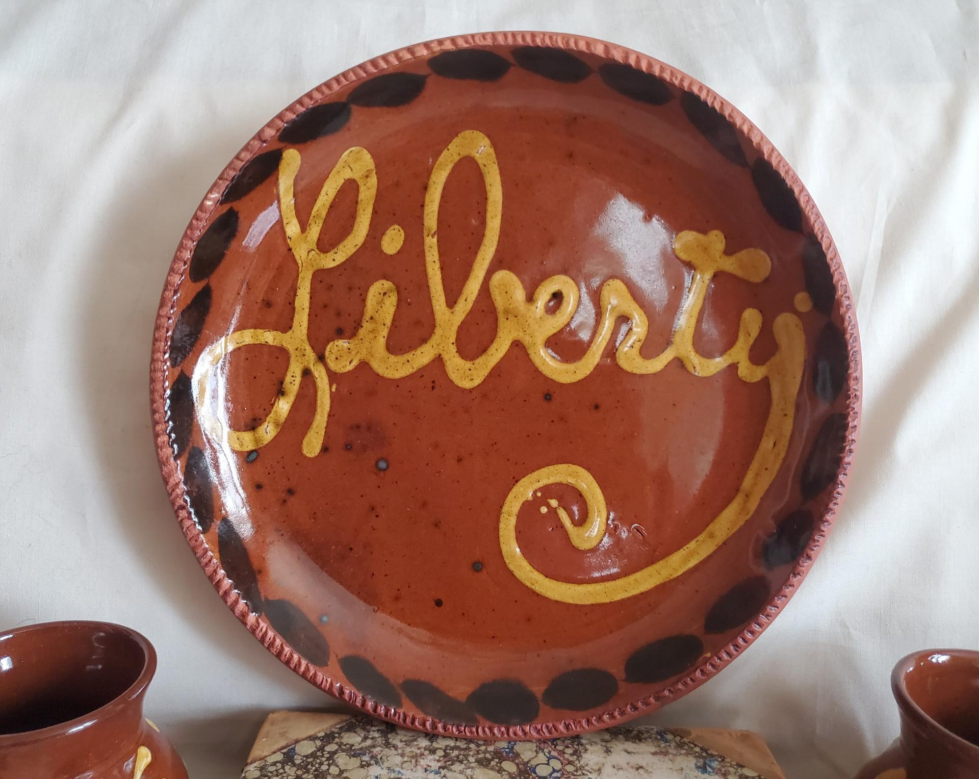 This beautiful one-of-a-kind drape-molded 11" (actual size 10.50") redware plate was handcrafted by Rick of Pied Potter Hamelin. Boasting coggled edges, this plate showcases a "Liberty" motif in yellow slip, complete with black splotches and specks in certain areas that add depth and cat paw prints on the back that add character. Being a unique piece, this pattern will not be reproduced again. Meticulously finished with a lead-free, food-safe glaze, this piece not only embodies timeless beauty but also ensures safety and functionality.