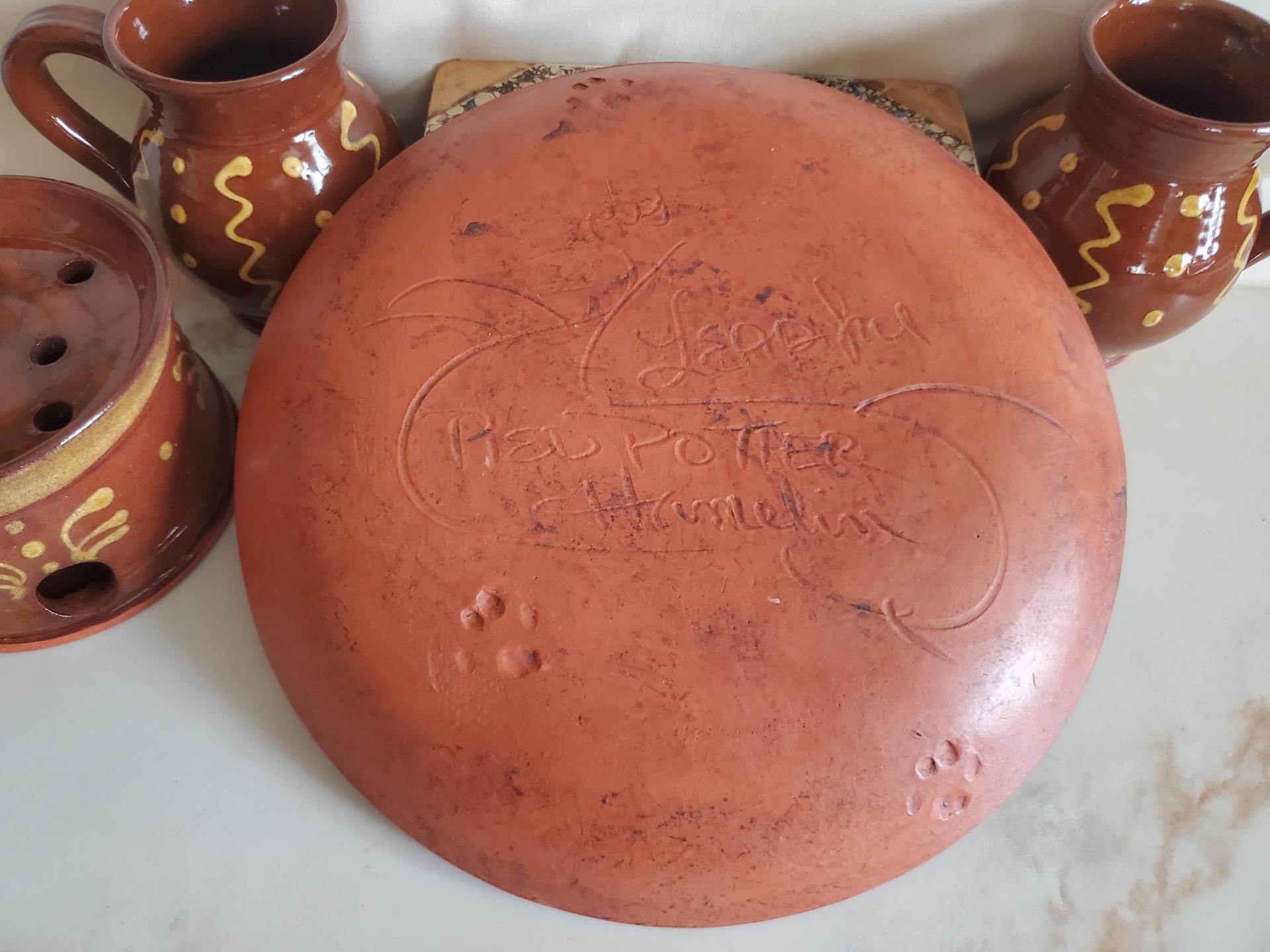 Welcome to our shop and our exquisite hand-made redware pottery! Crafted with care using our special blend of clays from various regions across the United States, each piece is a testament to our dedication to quality and color control. Rick employs the traditional art of slip trailing, adorning these pots with a variety of clay colors. Meanwhile, Garine employs the sgraffito and stamping techniques, creating intricate patterns by unveiling the vibrant red clay underneath the yellow slip. Fired twice for durability, our pots showcase a delightful, slightly aged appearance with subtle glaze crazing. As a charming touch, our plates bear the adorable paw prints left by our beloved Siamese cat, Ashby.