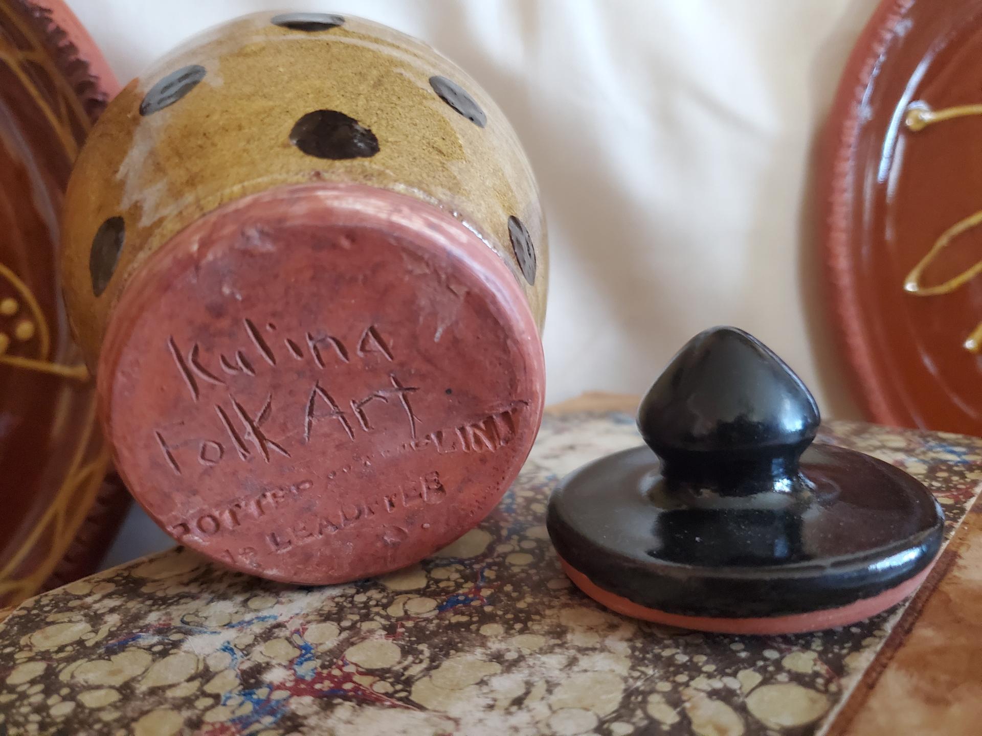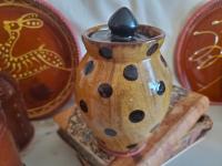 Add a touch of charm to your kitchen with this small redware jar thrown on the wheel by Rick of Pied Potter Hamelin. Featuring black dots and an acorn knob on the cover, it stands 5.50", tall including the acorn knob, and measures 3.75" wide at its widest. Lead-free and food-safe glaze ensures functionality and safety. Perfect for storing spices or other small kitchen essentials. A lovely addition to your primitive or French inspired farmhouse decor!