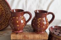 Beautiful redware mugs created by Rick of Pied Potter Hamelin! Each mug is skillfully thrown on the wheel, embellished with a squiggles and dots pattern, and antiqued on the unglazed surface for an old charm. Measuring approximately 2.50" in diameter at the base and 4.50" in height, with a width of 4.50" including the handle, these mugs are designed to hold 12 fluid oz. of your favorite beverage. Finished with Rick's specially formulated lead-free glaze, the white slip transforms into a beautiful golden hue during firing. Add a touch of handmade charm to your daily coffee or tea routine with these beautiful redware mugs.