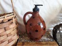 This redware soap dispenser jug was thrown on the wheel by Rick of Pied Potter Hamelin. Standing at 7.25" tall, including the black pump, and measuring 4.50" wide at its widest, this soap dispenser Jug is both charming and functional. Adorned with a black dots pattern, and finished with a food-safe glaze ensures its practicality while an antiquing finish adds character to the unglazed surfaces. Perfect for adding a touch of charm to your home.