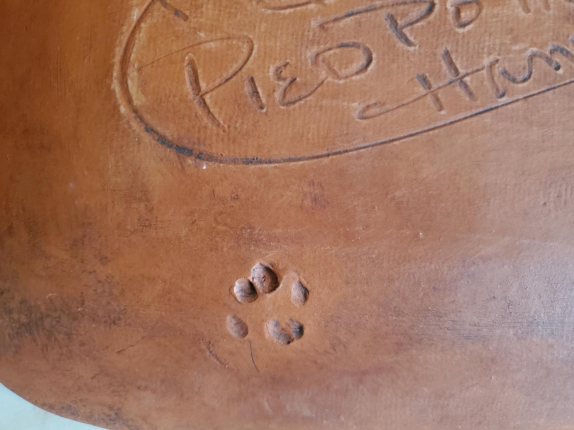 This is a one-of-a-kind piece for your home decor, a large 11" x 13" rectangular redware platter by Rick Hamelin. Handcrafted with care, this platter was drape-molded and has a coggled edge. It features a "Liberty" motif and includes a divided snake that represented the 13 colonies and was first published by Ben Franklin in his newspaper. The snake image became a powerful symbol of American unity, particularly during the American Revolutionary War. The back of the platter is antiqued and adorned with charming cat paw prints, adding a unique and whimsical flair. Being one-of-a-kind, this motif will not be reproduced. This platter is perfect for serving guests or displaying as a decorative accent and is sure to add a touch of charm to any space.
